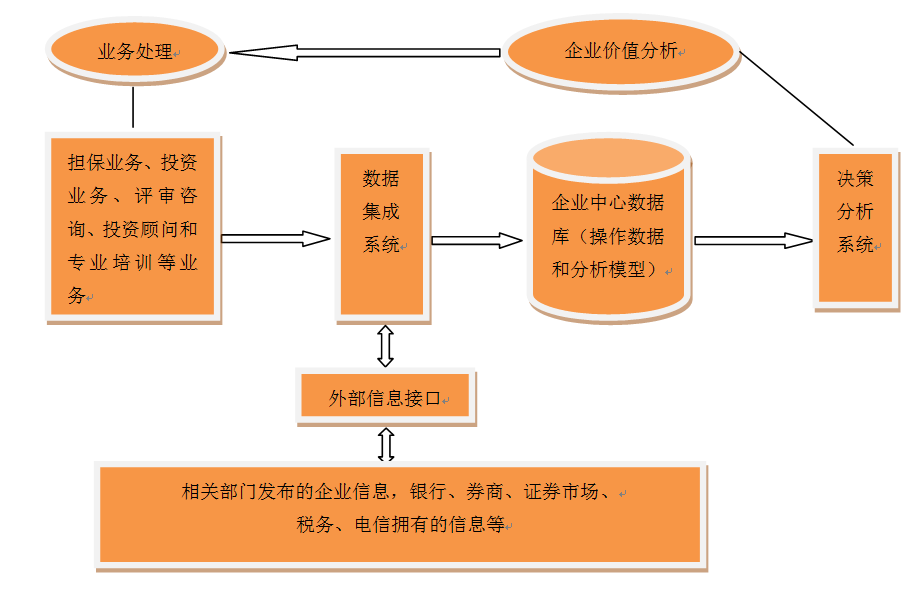 企業(yè)數(shù)據(jù)庫以企業(yè)中心數(shù)據(jù)庫為核心,還包括數(shù)據(jù)集成系統(tǒng)與決策分析系統(tǒng)。因此,企業(yè)數(shù)據(jù)庫的實施主要體現(xiàn)在企業(yè)業(yè)務(wù)和外部信息處理、企業(yè)數(shù)據(jù)集成系統(tǒng)、數(shù)據(jù)倉庫和決策分析系統(tǒng)四大部分。正如圖8-2所示,建立企業(yè)數(shù)據(jù)庫的目的最終體現(xiàn)在進行企業(yè)價值分析,以便更有效地開展業(yè)務(wù)上。